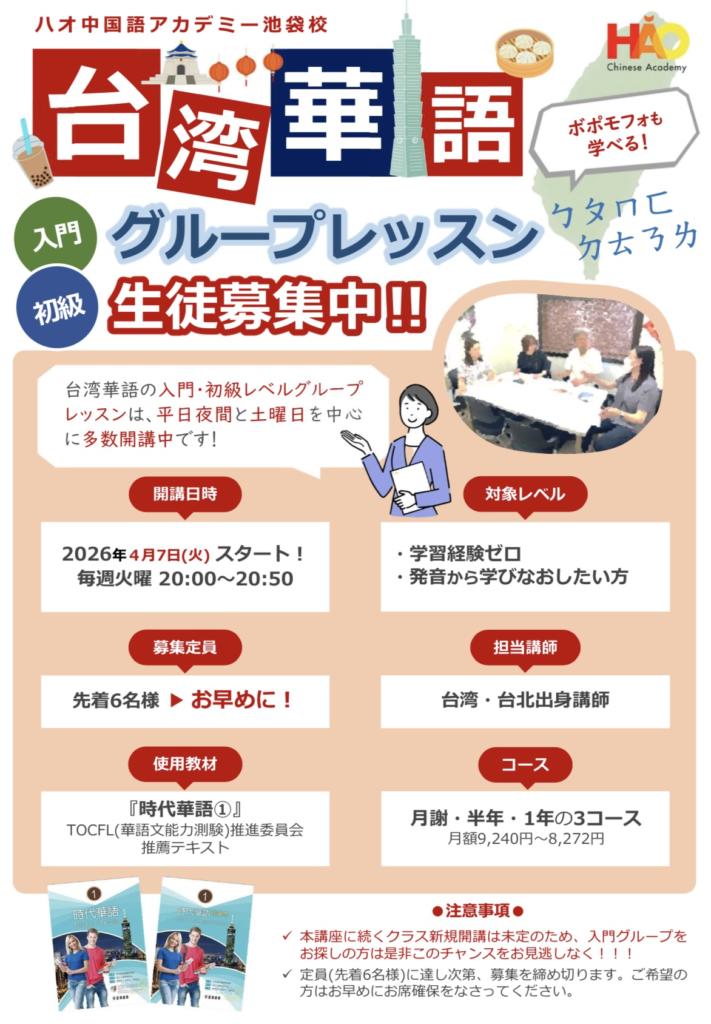 人気コースのひとつ【台湾華語グループレッスン】、池袋校舎には台湾出身講師が6名在籍中です。クラス開講時間等、お気軽にお問い合わせくださいませ。