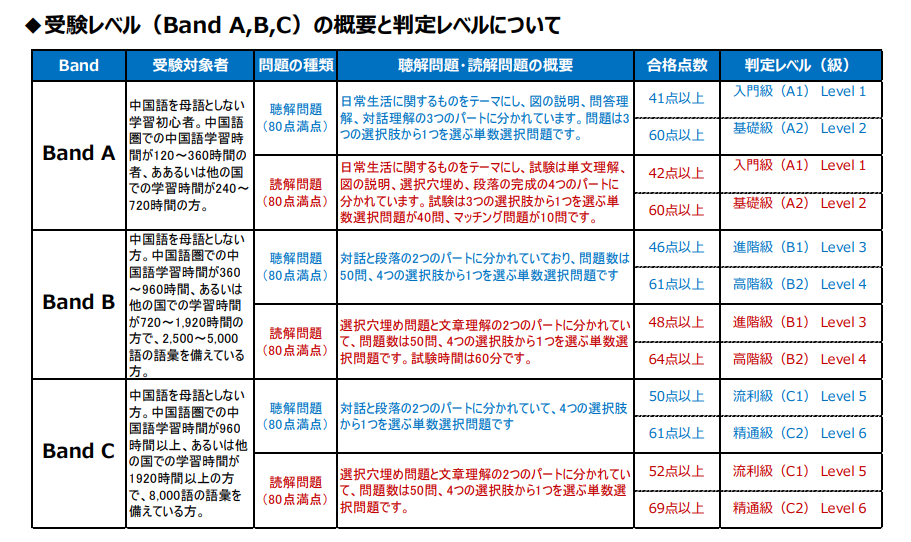 TOCFLの試験構造は、台湾華語の能力を、3クラス6レベルに分けています。3クラスはそれぞれBand A、Band B、Band Cに分けており、さらに各クラスは試験の成績によって更に2つのレベルに分かれ、全体としてLevel 1、Level 2、 Level 3、 Level 4、 Level 5、 Level 6の6つのレベルに分かれています。