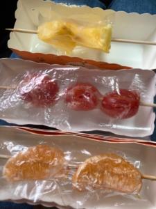 お好きなフルーツを溶けたグラニュー糖をつけて、これで完成!