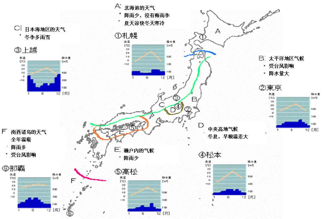 翻译:日本列島の大部分は温帯で、四季の区別は明確である。夏の前に梅雨があり、夏から秋にかけて台風が頻繁に襲来する。は世界平均の2倍近く降る。夏は南から季節風が吹き、冬は大陸から季節風が吹いて、日本海側は大雪になり、太平洋側は寒く乾いた天気人ることが多い。