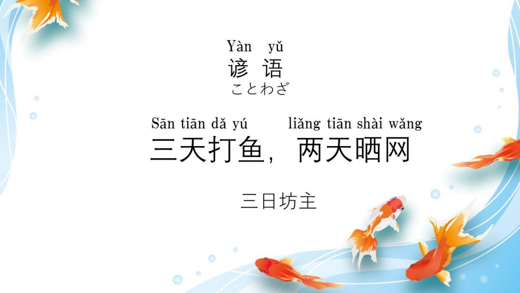 「三天打鱼两天晒网」はどういう意味でしょうか?直訳すれば、三日漁に出て二日網を干すということで、日本語は「三日坊主」の意味になります。これからも諺を紹介していきますね。