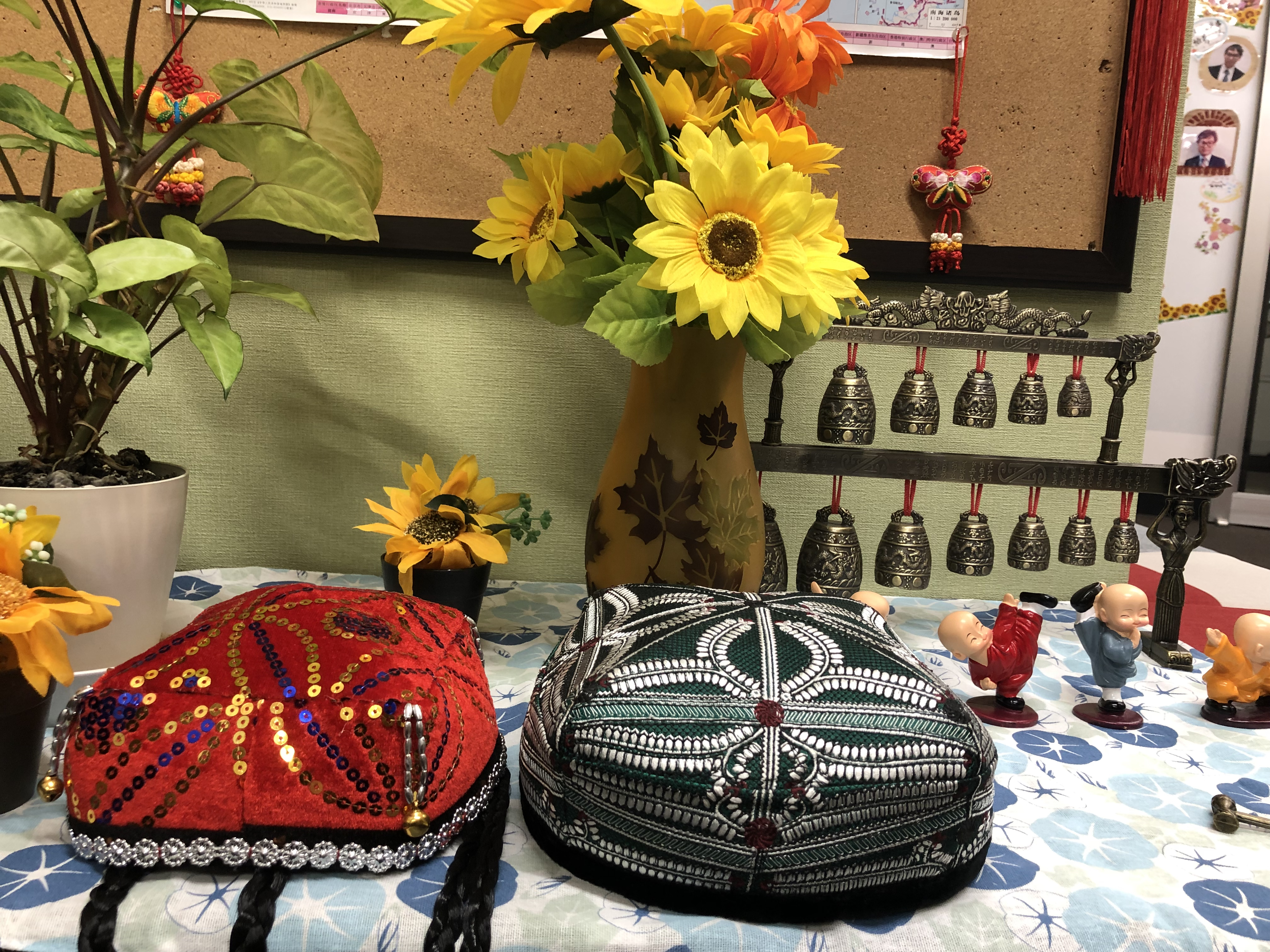 中国の西北部の新疆ウイグル自治区に住んでいるウィグル族の事、ご存じでしょうか?飯田橋校のよう先生がウィグル族の帽子を持ってきましたので、土曜日来校した生徒様がにぎやかにかぶって写真を撮りました。