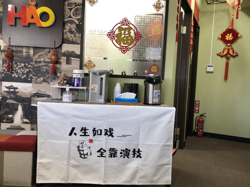皆さん、このコーナ毎回学校に来られる時に目にしますね。今日は中国のアリババからユニークな暖簾を買って来てお茶コーナに掛けました。
