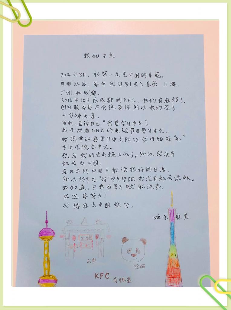 坂東さんの作文を紹介します。坂東さんは現在グループレッスンで中国語を勉強しています。会話用のHSKK教材を使ってレッスン受けています。