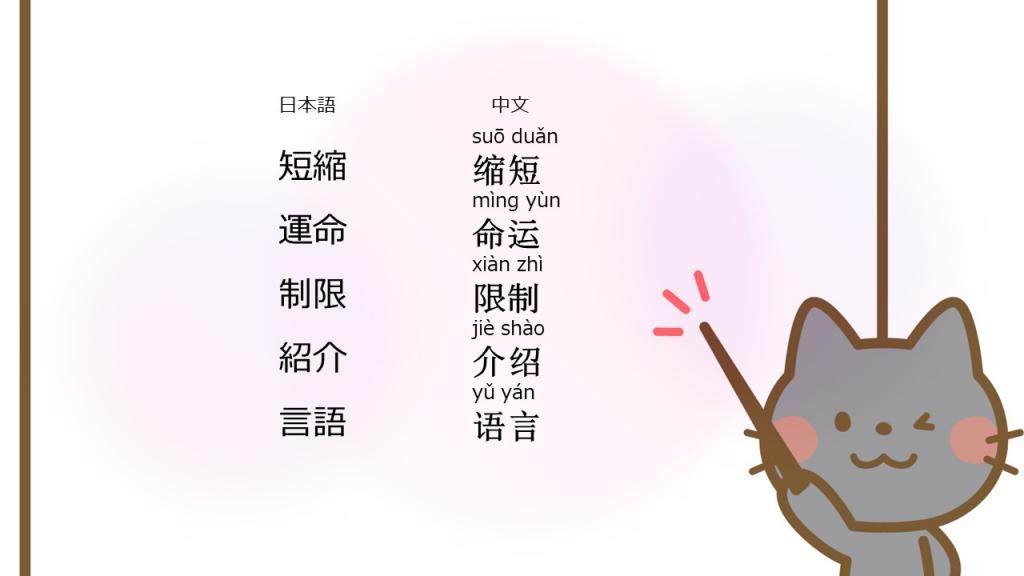 中国語の単語の順番を変えて使っている日本語の語彙を五個ピックアップしてみますね。