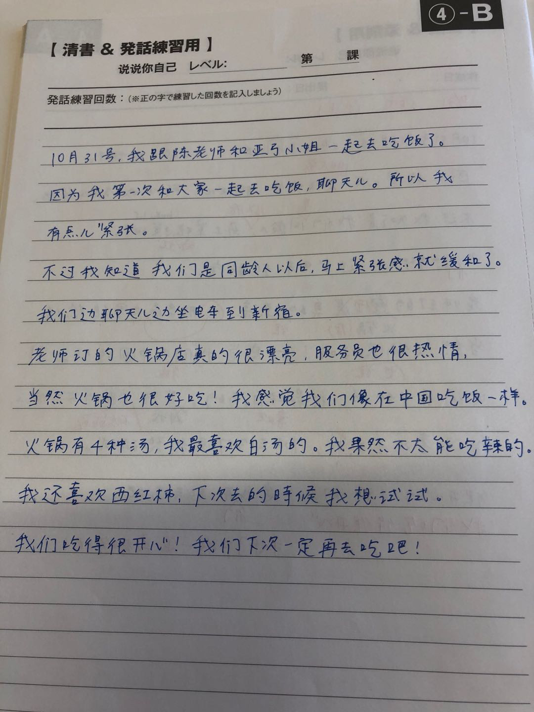 本日は楽しく毎週二回通学している内村美央様の作文を紹介します。内村さんは全くゼロからスタートした学習者です。勉強初めてまだ一年もたっていないのに、すでにこんなに立派に中国語で作文できるようになりました。この間飯田橋校の他の受講生と先生と火鍋を食べに行かれた時の作文です。