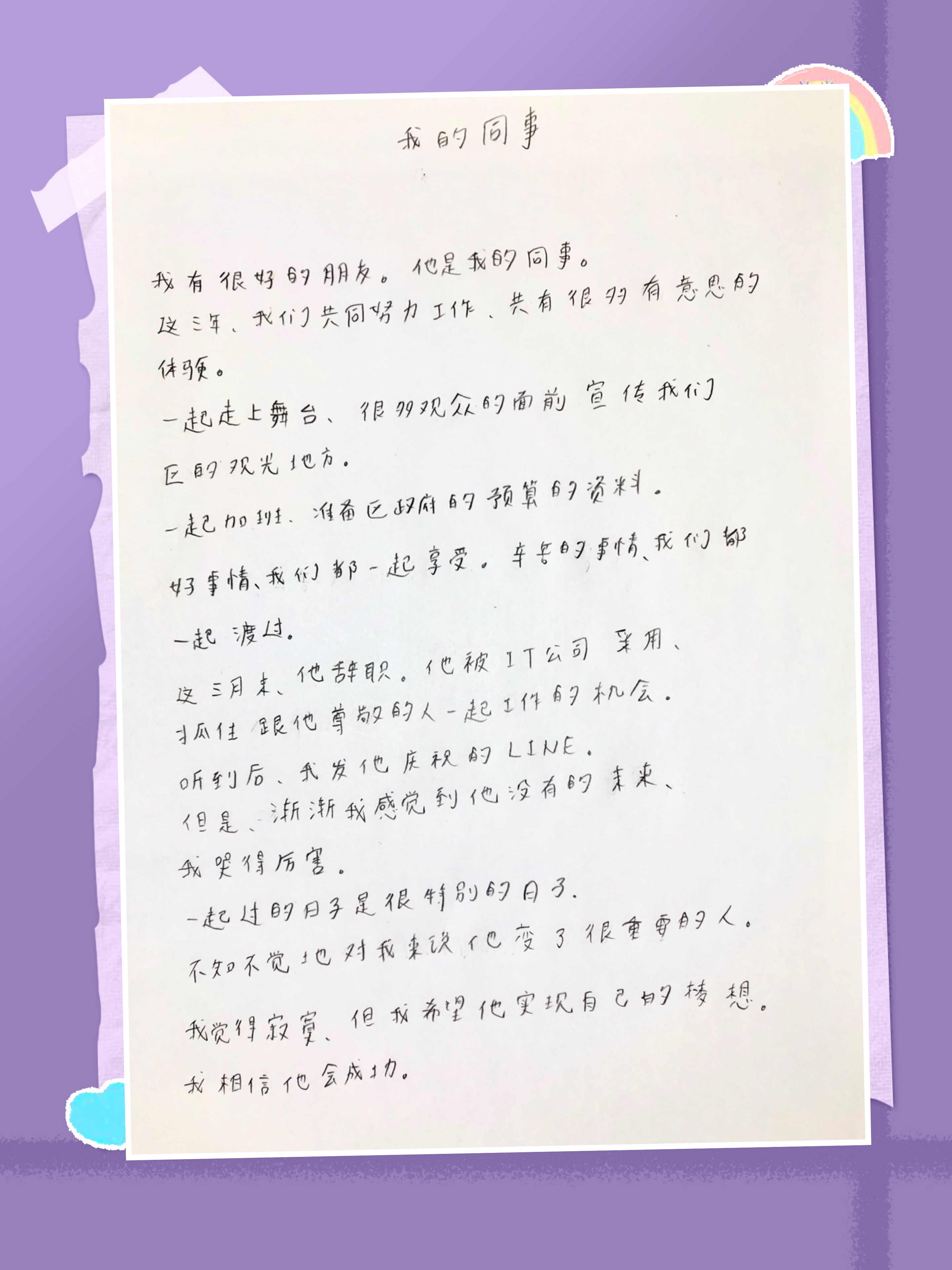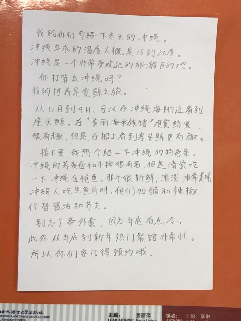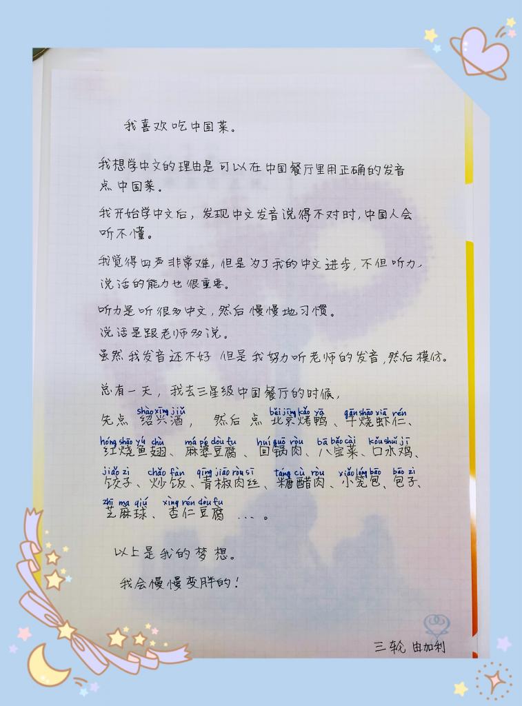 いかがでしょうか?今年の八月末にご来校し、ゼロから勉強し始めて、わずか三ヶ月ちょっとでこのように立派に中国語で作文ができるようになりました。今はHSK三級教材を使用し、週二回、一回2コマ受講されています。語学は短期集中の絶対に効率のいい学習結果が得られます。