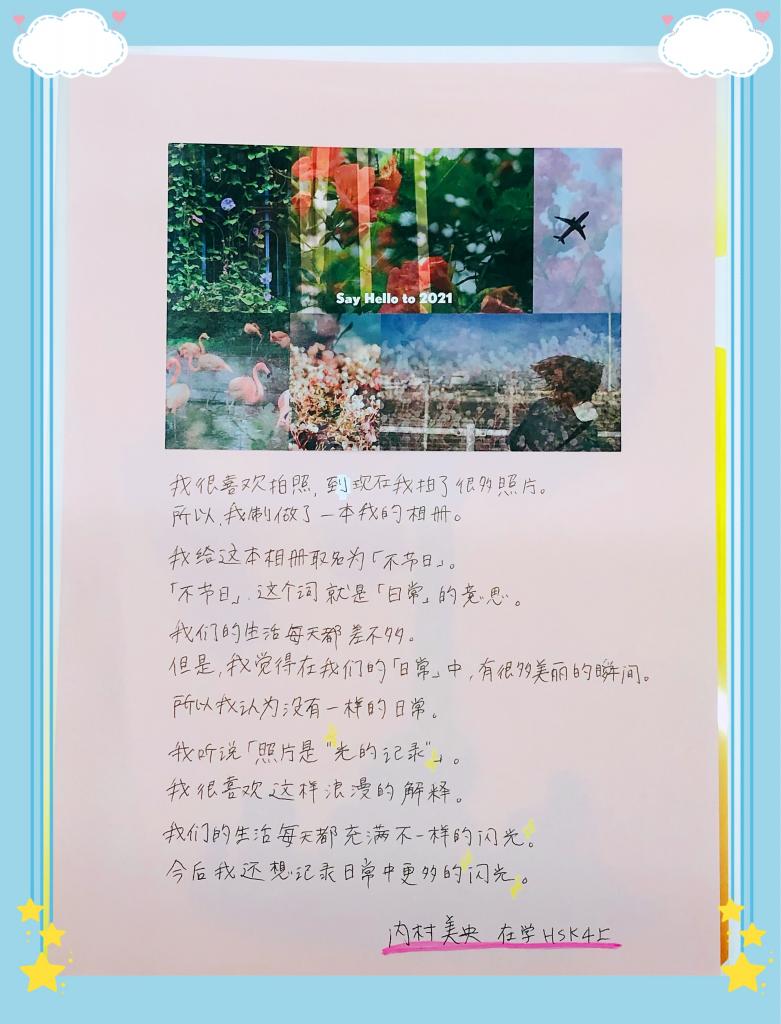 本日は内村さんの作文紹介です。ゼロスタートで一年間頑張って来ました。内村さんも週二回、一回50分レッスン2コマ受けています。大変な頑張り屋でHSK3級試験をほぼ満点で合格しました。趣味は撮影で、今回の作文には自分の撮影作品を張りました。