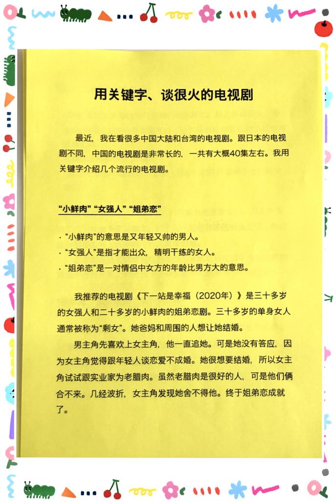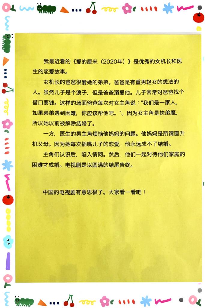 本日はM・Yさんの作文紹介です。現在HSK5級クラスで頑張っています。HSK5級ですと、中国語のドラマも見れるようになります。ドラマはいい勉強になりますので、ドラマ好きな方はぜひご利用し、リスニングの練習をしましょう。