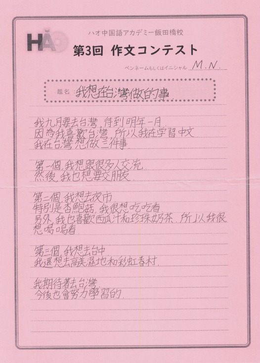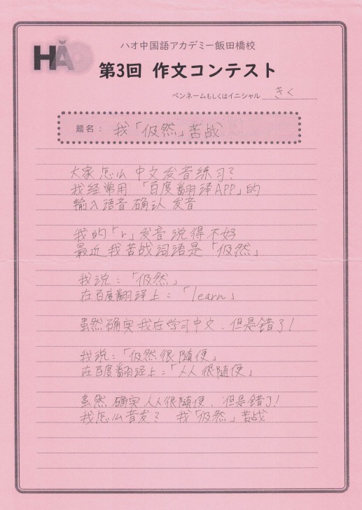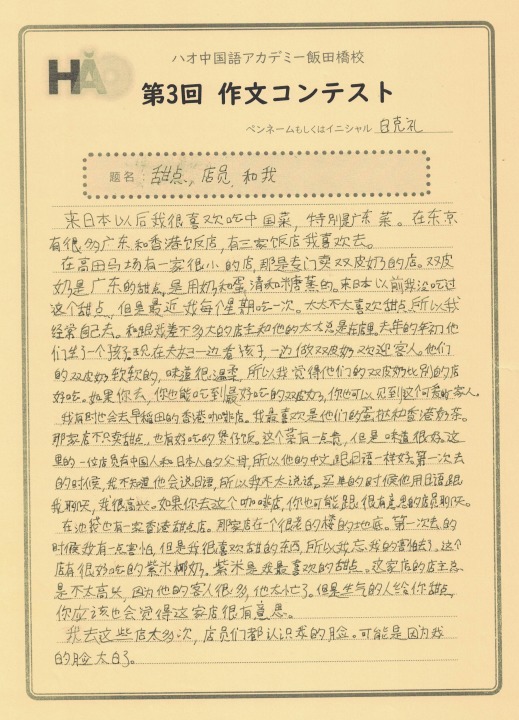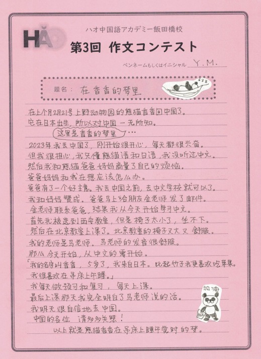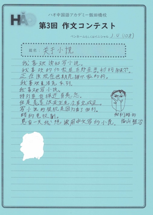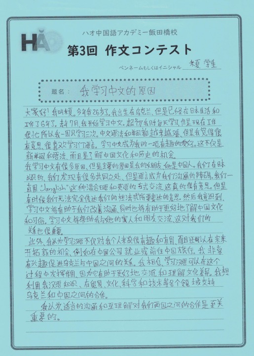 カテゴリー: 生徒様作文 投稿日: 2023年4月8日更新日: 2023年4月8日 作文コンテスト 生徒様作文 【作文コンテスト】応募作品⑪《介绍我最好的朋友》 こちらは、HSK4級グループレッスンのSさん。親しいお友達を紹介してくれました。シンガポールに留学していた時に知り合ったロシア人女性だそうです。現在はイスラエル在住とのことですが、お互いに行き来して交流を続けているようですね。最後の一文に、大切な願いが込められています! 投稿日: 2023年4月8日更新日: 2023年4月8日 作文コンテスト 生徒様作文 【作文コンテスト】応募作品⑩《自我介绍》 こちらの作文は、2月からマンツーマンレッスンを受けているYさんです。学習経験はゼロでしたが、2カ月ほどでここまで立派な自己紹介文が書けるようになっています。中国語の語順を正確に把握されていますね!ここまできちんとアウトプットできれば、初歩のコミュニケーションとしては全く問題ありません。ぜひ自信をもって続けてください! 投稿日: 2023年4月8日更新日: 2023年4月8日 作文コンテスト 生徒様作文 【作文コンテスト】応募作品⑨《关于小说》 こども中国語のJくんは、前回にも増して立派な作文です!好きな作家は東野圭吾と、シャーロックホームズシリーズで有名なコナン・ドイルだそうです。現在は『バスカヴィル家の犬』を読んでいるのですね。将来は中国語で書かれた小説を読めるようになるのが夢とのことです。本当にJ君の将来が楽しみです! 投稿日: 2023年4月8日更新日: 2023年4月8日 作文コンテスト 生徒様作文 【作文コンテスト】応募作品⑧ 《我“仍然”苦战》 こちらは、土曜のHSK4級グループレッスンに通っていらっしゃるきくさんです。たしかに中国語の「r」の発音は難しいですね。今は便利なアプリがありますので、発音をチェックするのもずいぶん簡単になりました。さすがに発音矯正までは面倒見てくれないですから、レッスンの際にコツをお教えしましょう!仍の字は間違えやすいですので、気をつけてくださいね^^ 投稿日: 2023年3月31日更新日: 2023年4月8日 作文コンテスト 生徒様作文 【作文コンテスト】応募作品⑦ 《我学习中文的原因》 こちらは、昨年から週に6レッスン受講を続けていらっしゃる、 ミーシャさんの作品です。 ウクライナ人男性で、中国人の女性とお付き合いされています。 真剣な思いがひしひしと伝わってくる熱い文章です。 将来的には国家の垣根を越えて それぞれの国をつなぐ架け橋の役割を担いたいとのことです。 大変立派な内容で、感服してしまいました! ハオでのレッスンが夢の実現に少しでも 役立てていただければ、とても光栄です! 投稿日: 2023年3月31日更新日: 2023年4月8日 作文コンテスト 生徒様作文 【作文コンテスト】応募作品⑥ 《甜点、店员和我》 こちらは、毎週月曜に受講されている白先生、 アメリカ人の学生さんです。 行きつけの中国料理店を3軒紹介してくれています。 それぞれのお店の特徴とおすすめメニュー、店員さんの様子などが 非常にこまやかに書かれています。 店員さんとのやりとりが、 面白おかしく描写されているところも、 大変魅力的な作品ですね! 投稿日: 2023年3月31日更新日: 2023年4月8日 作文コンテスト 生徒様作文 【作文コンテスト】応募作品⑤ 《在香香的梦里》 こちらは、火曜日の昼間にマンツーマンレッスンを 受けていらっしゃる、Y.M小姐の作文です。 先日中国に帰った上野動物園のパンダ「シャンシャン」の 夢の中を題材に取り上げた作品です。 飯田橋校での体験レッスンから最初のレッスン、 そしてレッスンを通して先生の中国語が 聞き取れるようになった喜びを シャンシャンになった自分が紹介しているといった内容です。 う~ん、ストーリーや場面設定も凝っていて、 非常によく書けています! みなさんも、ぜひ読んでみてください! 投稿日: 2023年3月25日更新日: 2023年4月8日 作文コンテスト 生徒様作文 【作文コンテスト】応募作品④ 《我的手辛苦了》 作文コンテスト、4人目の応募者は、 こちらもこども中国語の傘傘(さんさん)くん。 「我的手辛苦了!」 タイトルも独特でおもしろい! ビャンビャン麺の漢字を二回も書いて たしかに手も疲れたことでしょう! イチゴの絵もかわいらしいです♪ 投稿日: 2023年3月25日更新日: 2023年4月8日 作文コンテスト 生徒様作文 【作文コンテスト】応募作品③ 《我》 作文コンテスト、こちらはこども中国語のOくんです。 タイトルはズバリ!「我」! 自分の似顔絵も描いてくれました。 誕生日だったんですね~! 祝你生日快乐! 投稿日: 2023年3月25日更新日: 2023年4月8日 作文コンテスト 生徒様作文 【作文コンテスト】応募作品② 《我想在台灣做的事》 作文コンテスト、こちらは台湾華語レッスンの生徒様です。 台湾に行ったらやりたいことを書いていただきました。 繁体字でしっかりと書いていますね! たくさん友達を作って、 夜市に行ったり、台中に遊びに行ったりできますように! 前のページへ345675/10...10 次のページへ