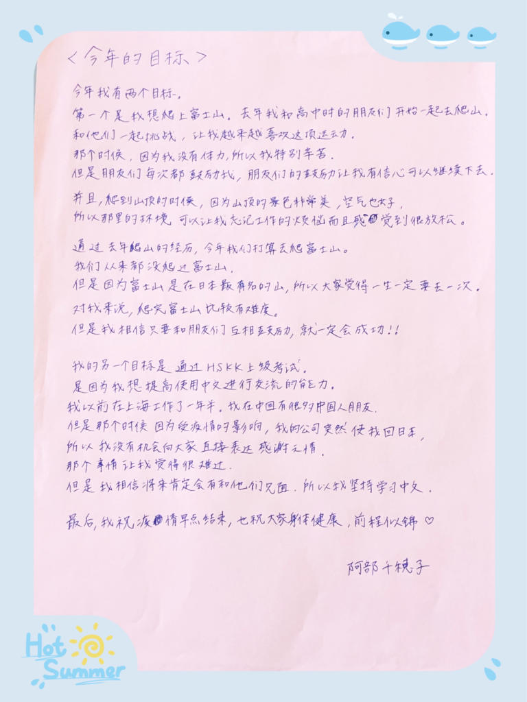 本日の作文は中国赴任から戻り、再度学校に来て勉強している阿部さんからです。