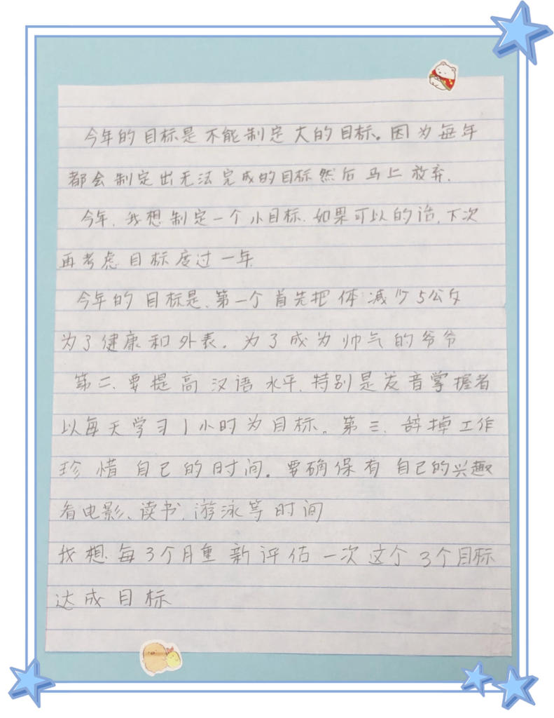 少し遅くくなりましたが、本日もう一篇の作文を紹介します。飯田橋校で長く勉強なさっているK.Kさんの作文です。三ヶ月一回自分の今年の目標を振り替えてみる!素敵ですね。