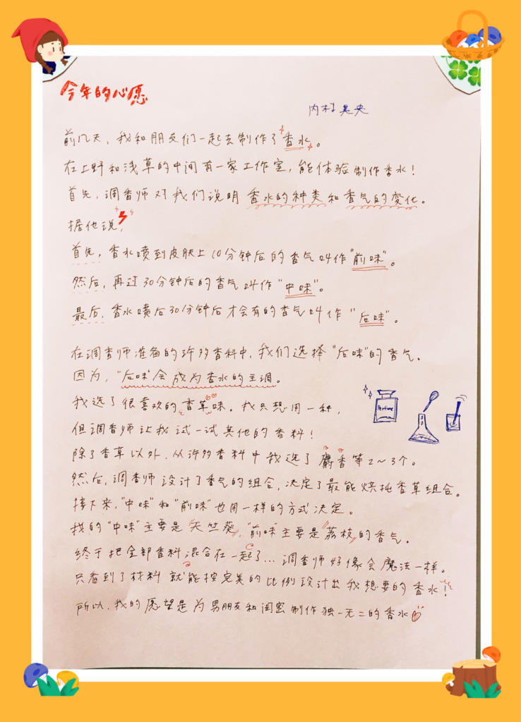 第14篇は現在マンツーマンレッスンで頑張っているU.Mさんの作文です。オリジナル香水を作る素敵な話です。