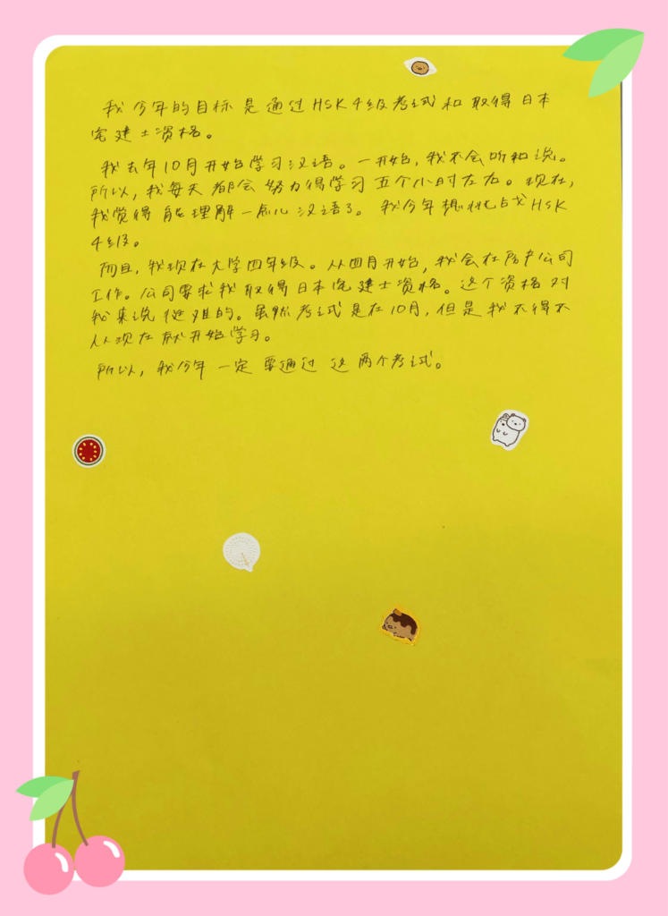 第十五篇は今年四月に社会人になるN.Mさんの作文です。ハオで半年でHSK2級と3級を高得点で合格されました。今年中に4級にチャレンジしたい事で今も毎週頑張って通っています。N.Mさんのようにマンツーマンレッスンは短時間でレベルアップが可能です。引き続き頑張りましょう!