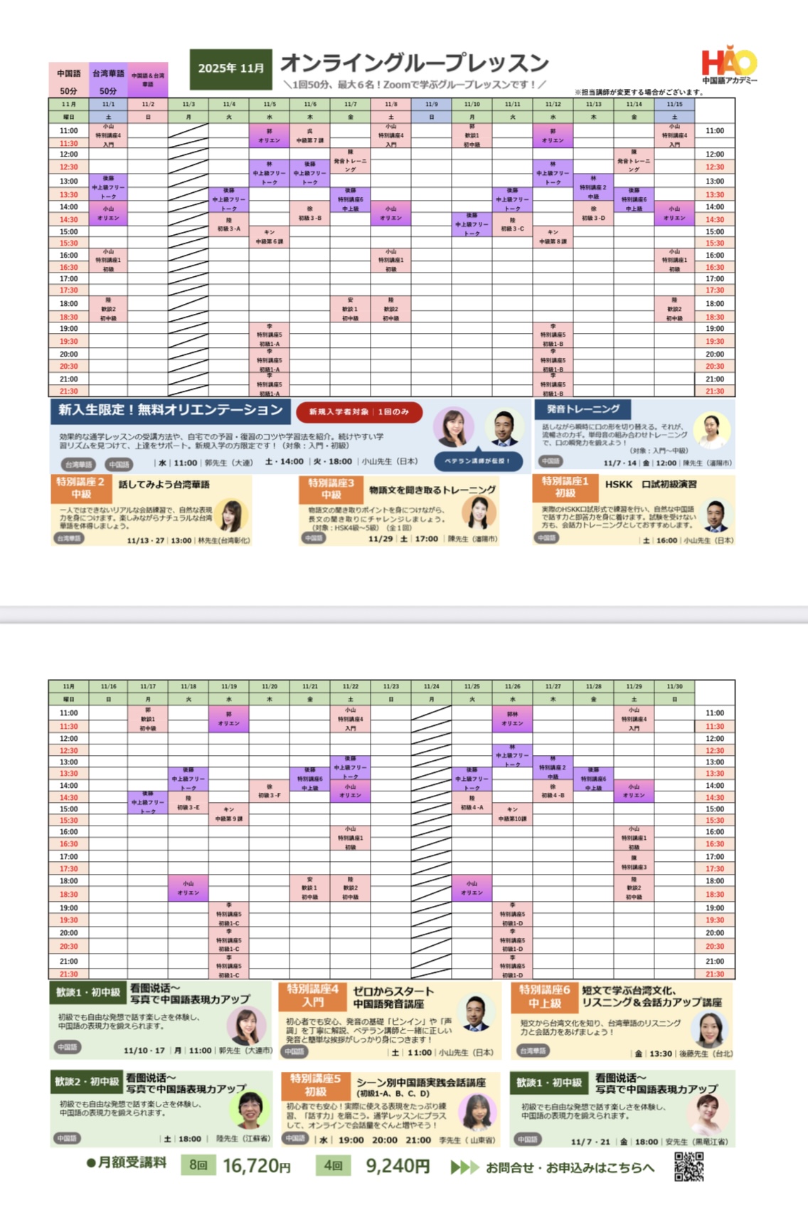 中国語・台湾華語のコースがそれぞれあり、定員6名の1回50分間のzoomレッスンを全国のハオ校講師が担当しています。