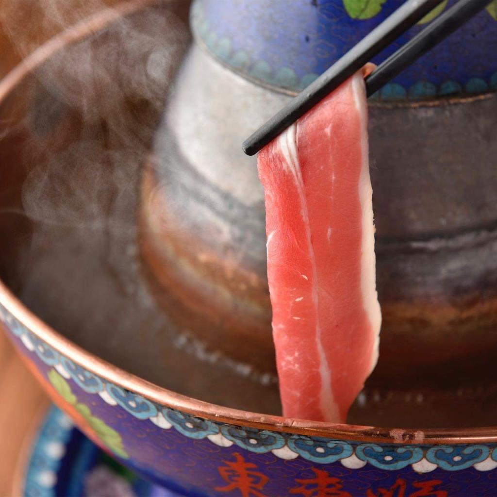 「北京涮羊肉」は皆さんがよくご存じの「四川火锅」(四川鍋)とは違い、さっぱりしていて初めての方でも食べやすい味です。鍋の素はほぼお湯だけで作っており、お肉は大体羊肉を使用、特製の鍋「铜锅」に入れて、さっと通して、北京風の「芝麻酱」(ごまだれ)につけて食べるのが一般的です。
