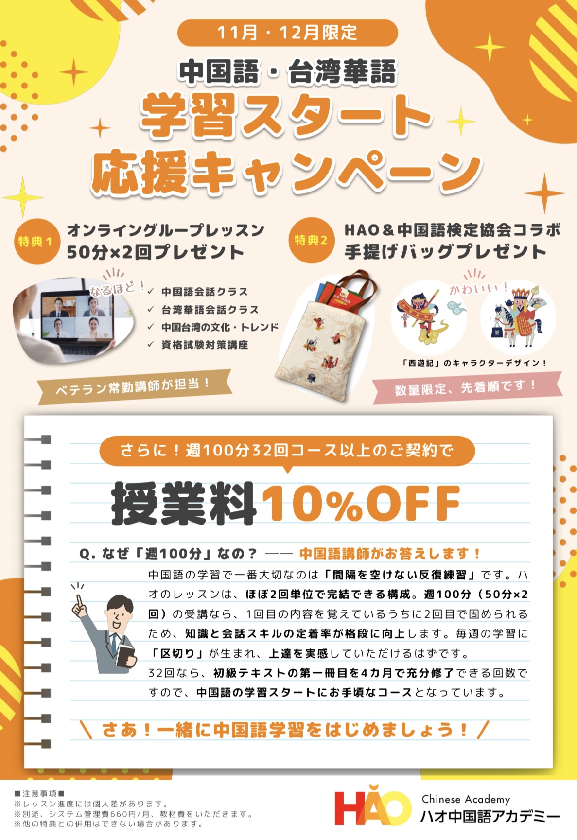 さて、ハオ全校ではこの11月から中国語学習スタートをご検討の方(※)へ数量限定先着でオリジナル手提げバッグをプレゼントしております。