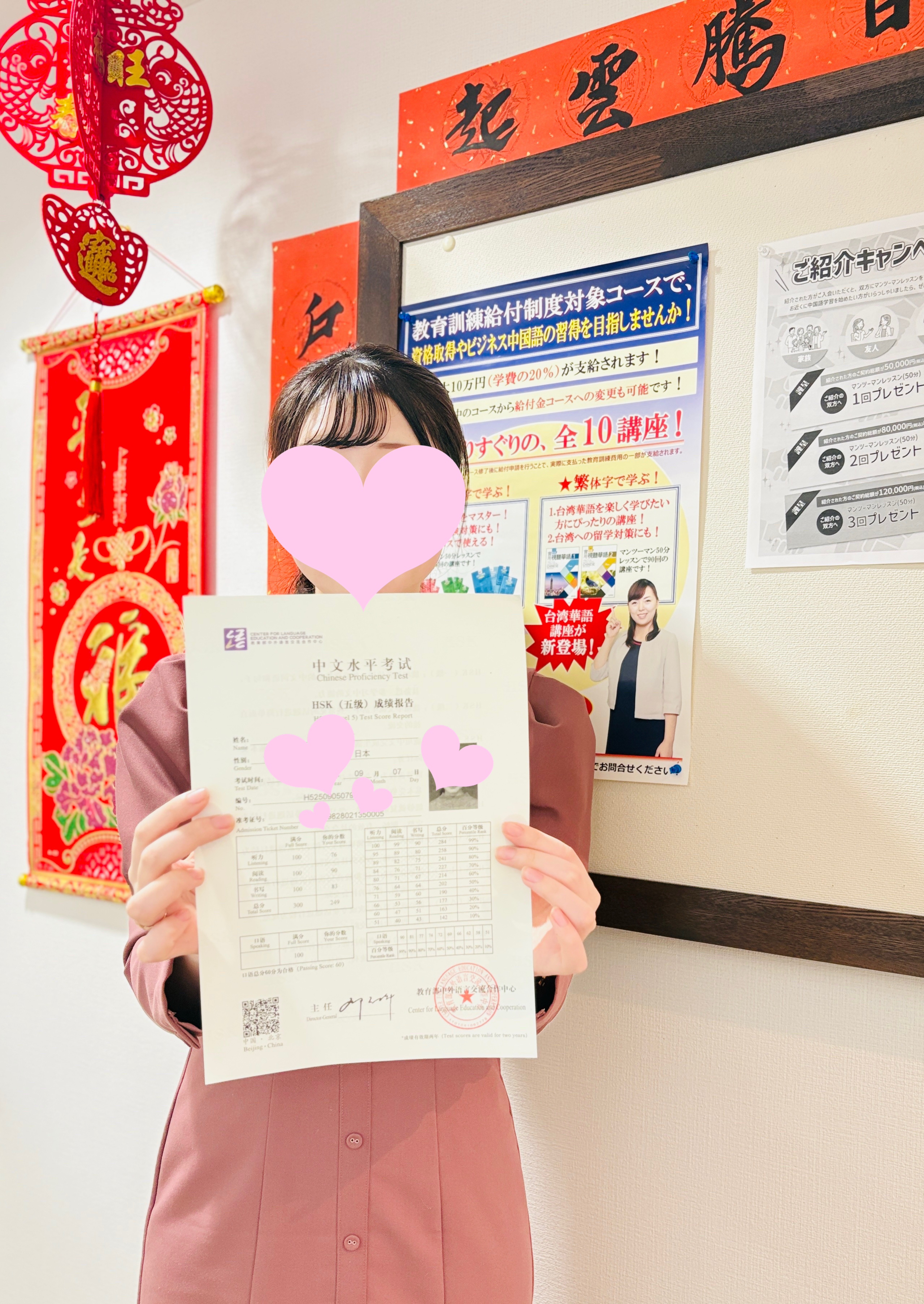 HSK4級のご成績表と一緒に記念撮影♪トータルスコア270点とすばらしいご成績でした!