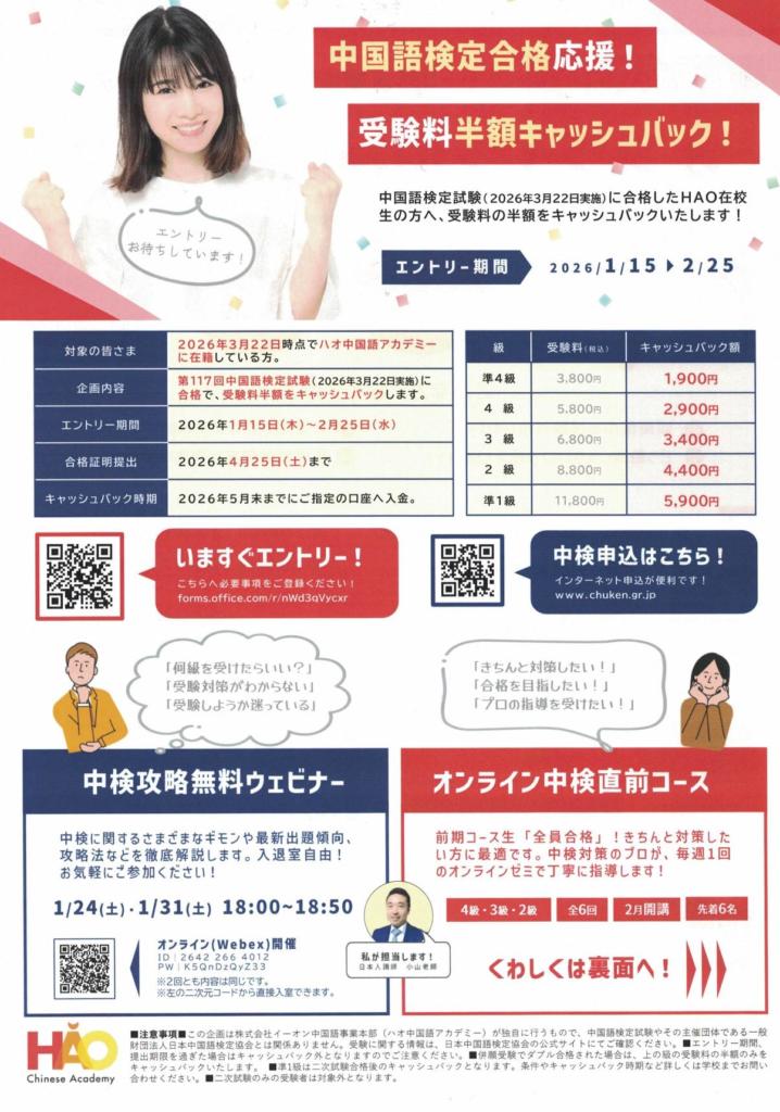 もしあなたが「よし、中検3級か4級に挑戦してみよう!」と思ったなら、11月に実施される中国語検定試験は、これまでの学習成果を試す絶好の機会です。