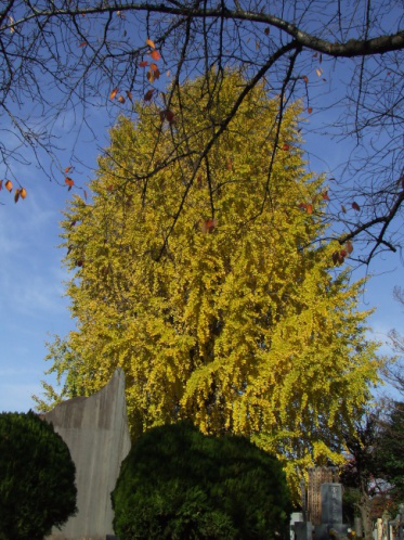 ”我很喜欢去灵园散步“,如果我这样说,大部分的外国人会觉得很奇怪,恐怕会被他们说 ”你干吗特意去陌生人的墓地呢? 不会吧!“ 可是这些灵园都是特别有名的人士们的墓地,而且东京都的职员每天都在好好儿打扫,管理得很好,是散步特别好的地方。这些灵园也有很多银杏树。灵园里当然没有高的建筑物,只有墓碑,所以你能360度地欣赏银杏树。蓝天和金黄色银杏的搭配漂亮极了。