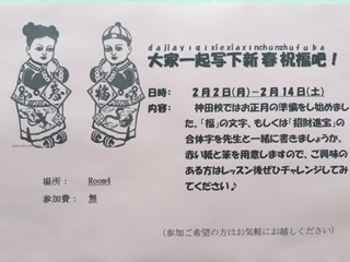 さて、2月2日(月)~2月14日(土)まで神田校では「福」の文字、もしくは「招財進宝」の合体字を書いていただくための赤い紙と筆を用意しますので、ご興味のある方はレッスン後ぜひチャレンジしてみてください♪