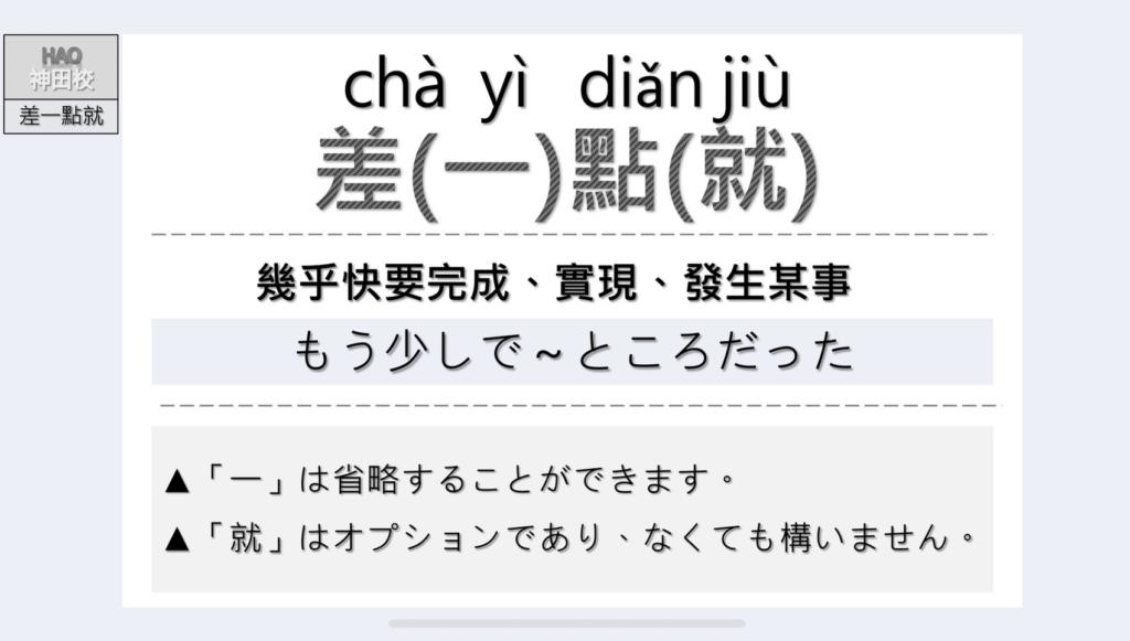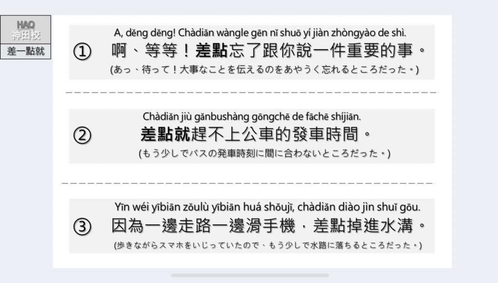 今日簡単に差一點就…の使い方と例文を紹介します。