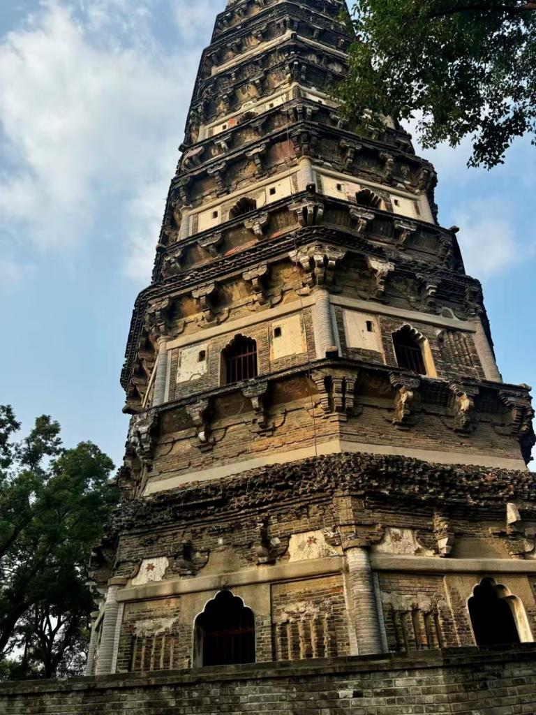山頂に登ると、千年以上の歴史を持つ虎丘塔(こきゅうとう)が姿を現します。黄金色のイチョウや真っ赤なモミジに囲まれた塔は、荘厳で幻想的な雰囲気を漂わせています。