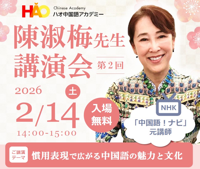 再び陳淑梅先生前回大好評をいただいた本講演会。今回、再び陳淑梅先生をお迎えしての第二回目の講演会開催が実現しました!中国語を学ぶとき、その言葉に込められた文化や価値観を理解することが大切です。中国人の知恵や暮らしの感覚が詰まった慣用句や四字熟語を、陳先生がわかりやすく解説します。“滴水之恩,涌泉相报”“吃亏是福”“顺其自然”など、日常会話で自然に使える表現を通して、中国語の奥深さと文化の魅力を体感しましょう!