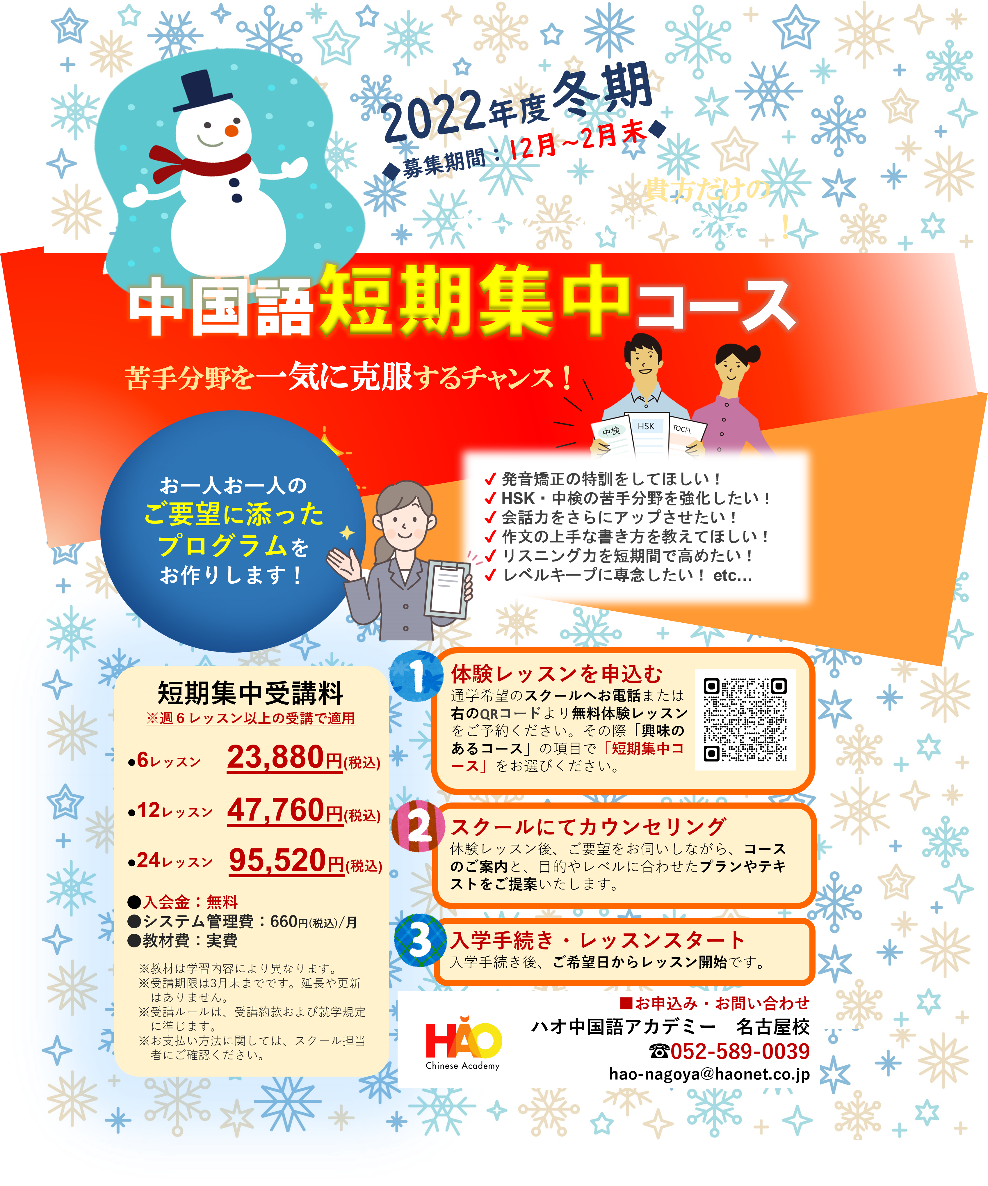 この冬で会話力を上げたい方、検定対策をされたい方、出張赴任で早く中国語力を身に付けたい方、ぜひお見逃しなく!