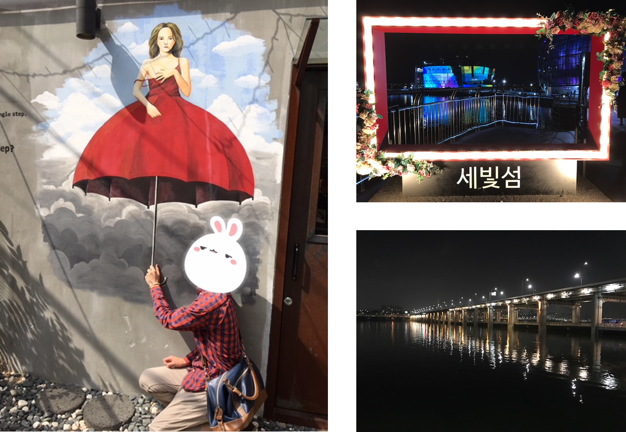 第二天的第一站是梨花洞壁画村。由于事前调查不足,我不知道这些壁画是何时何人所作,不过墙上活灵活现的壁画,着实有趣。午餐专门去吃了网上介绍的紫菜包饭,刚一走近,老板娘就用熟练的日语说道“ここです!本物ですよ!”连菜单上也只有韩语、英语和日语,想想也真是有趣。下午我们又去了昌德宫和昌庆宫,感受了历史的积淀。晚上来到汉江边欣赏了夜景。