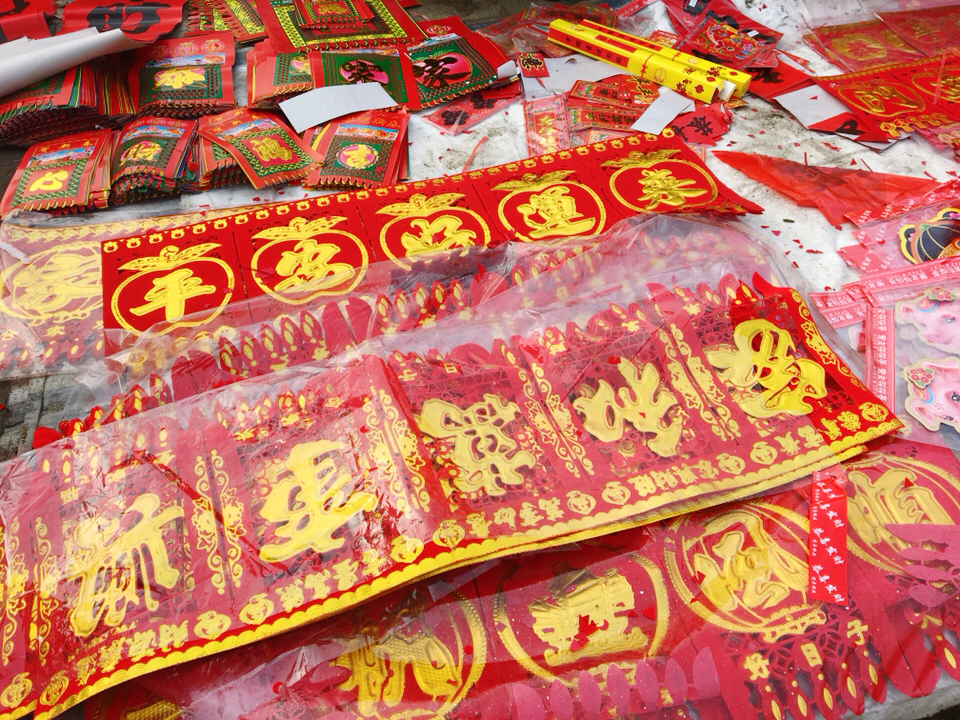 お正月飾りが売られています。赤と金が鮮やかですね。