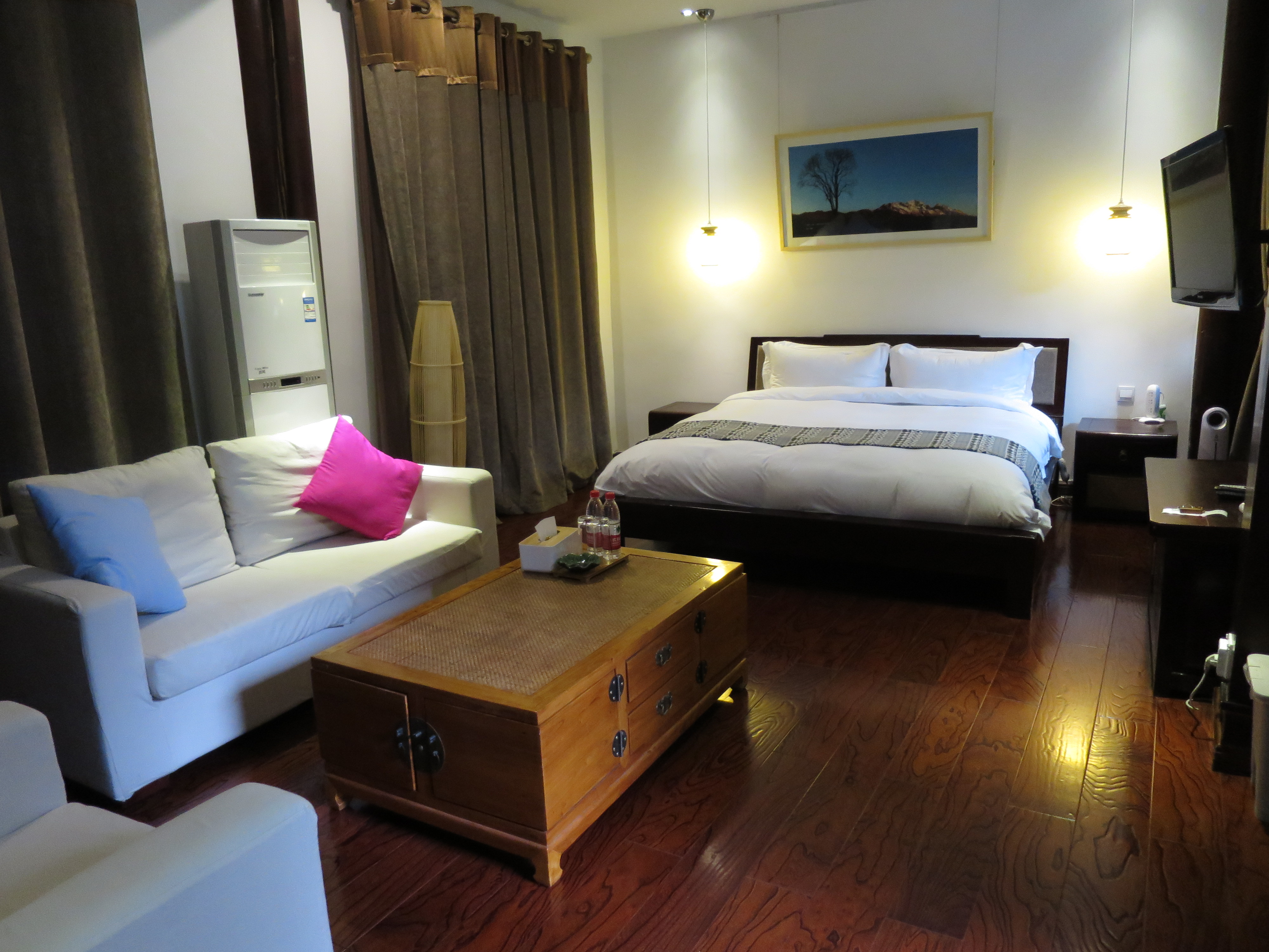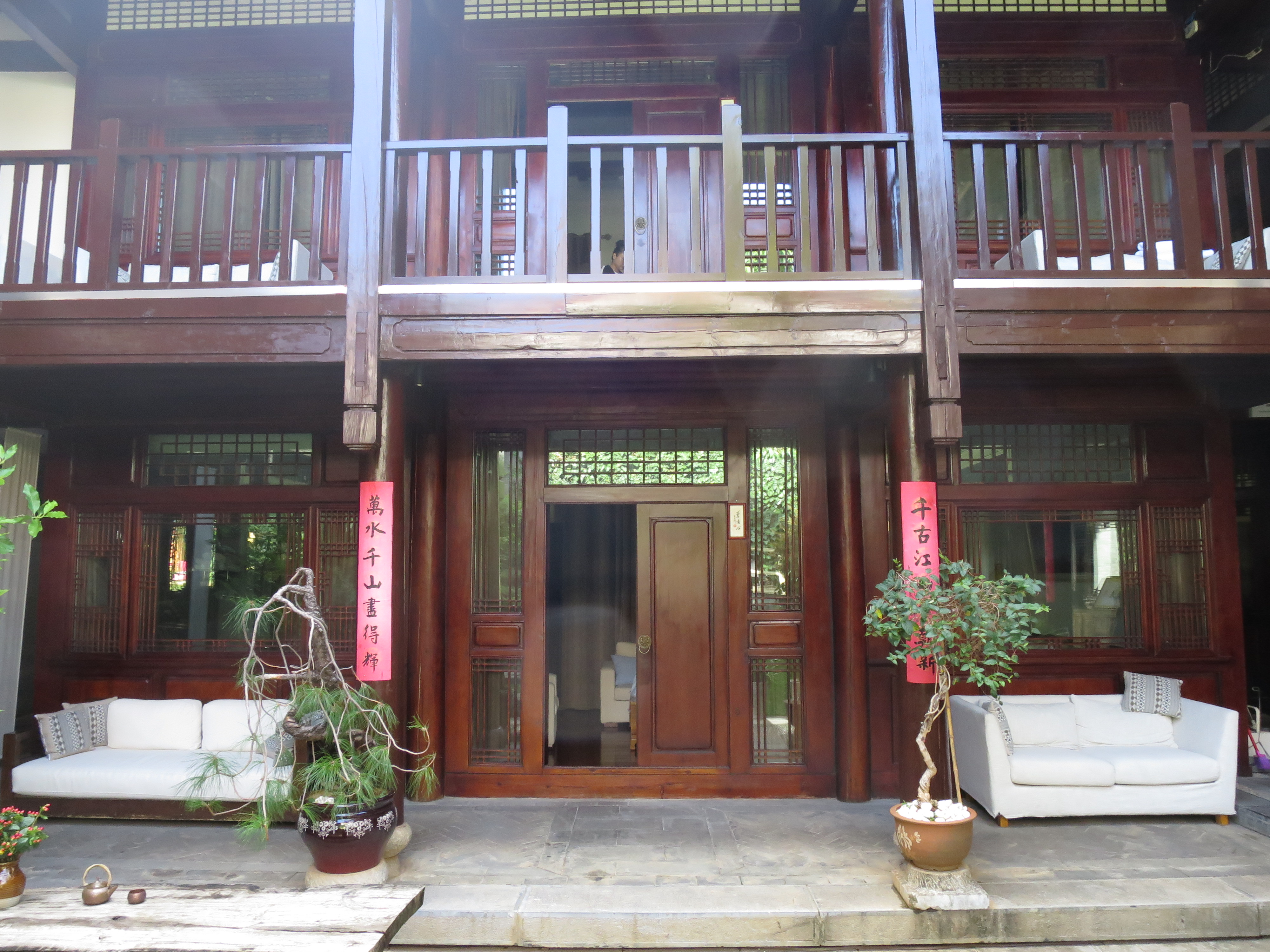私の泊まる宿は「2018年 麗江古城十家特色文化主題客栈」のうちの一つで、街の喧噪からは離れ、いわゆる三坊一照壁と言われる構造の建物だった。中庭にある池には鯉が泳いでおり、水の音だけが清らかに聞こえてくる。室内も広々としていて、外にはソファーが置かれていた。さすがに特色文化主題客栈だけのことはあり、歴史と伝統を感じることができた。