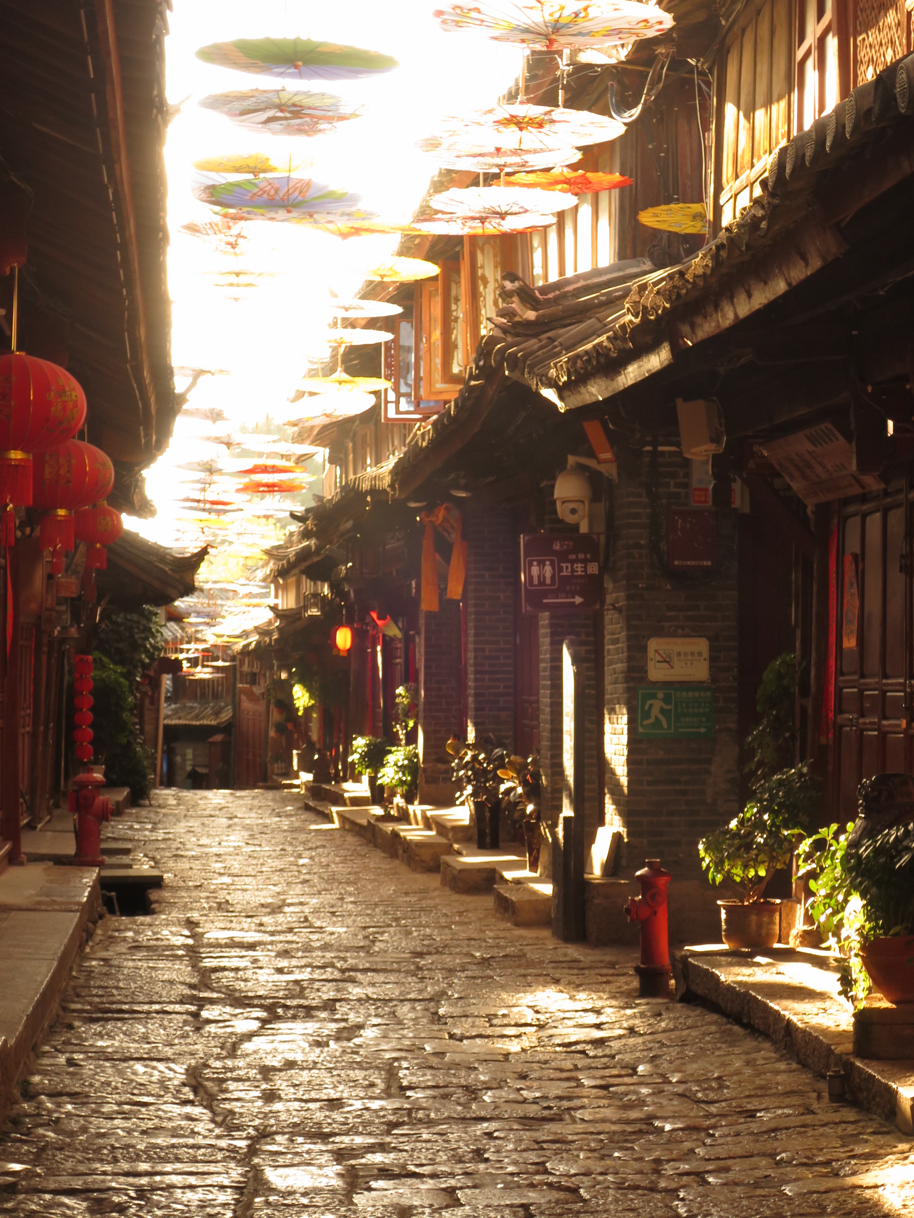 早朝の空気はとても新鮮だったが、少し肌寒かった。日差しがちょうど目の位置にあり、まぶしくて前が見えなかった。通りにはほとんど人影がなく、時には私以外誰もいないこともあり、景色を存分に満喫することができた。小路を曲がると、石畳の上にレースのカーテンのような光線が差し込んでいた。
