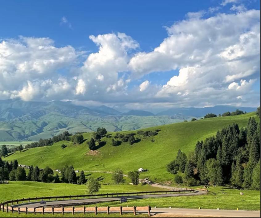 ジュンガル盆地(北疆):草原や丘陵、湖が広がり、水資源が豊富です。