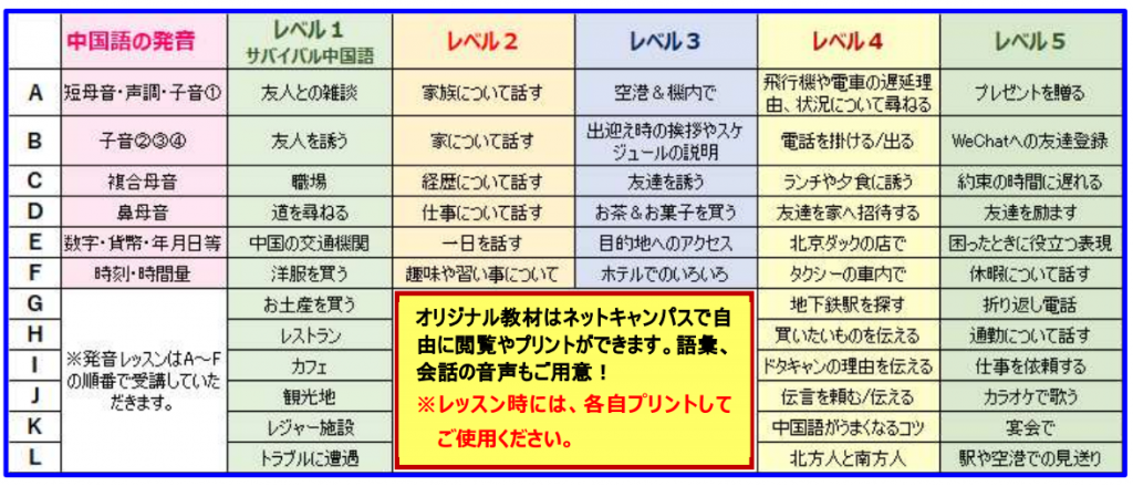 入門の発音から初級日常会話レベル1~レベル5まで、下記の54レッスンから選んでいただけます。