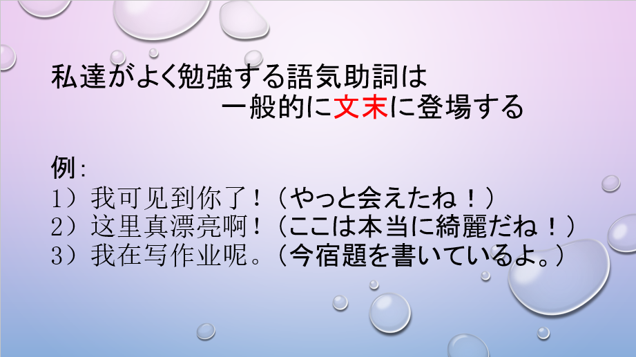 語気助詞の位置、一般的に本で学ぶのは、「文末に置く」場合が多いですね。