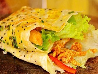 中国語で“煎饼果子”と言います。日本語に訳すと、「中華風あげパンのクレープ巻き」です。ソースを付けて食べます。辛いソースや甘いソースにはいろいろなものがありますが、お好みのソースでお召し上がりください。