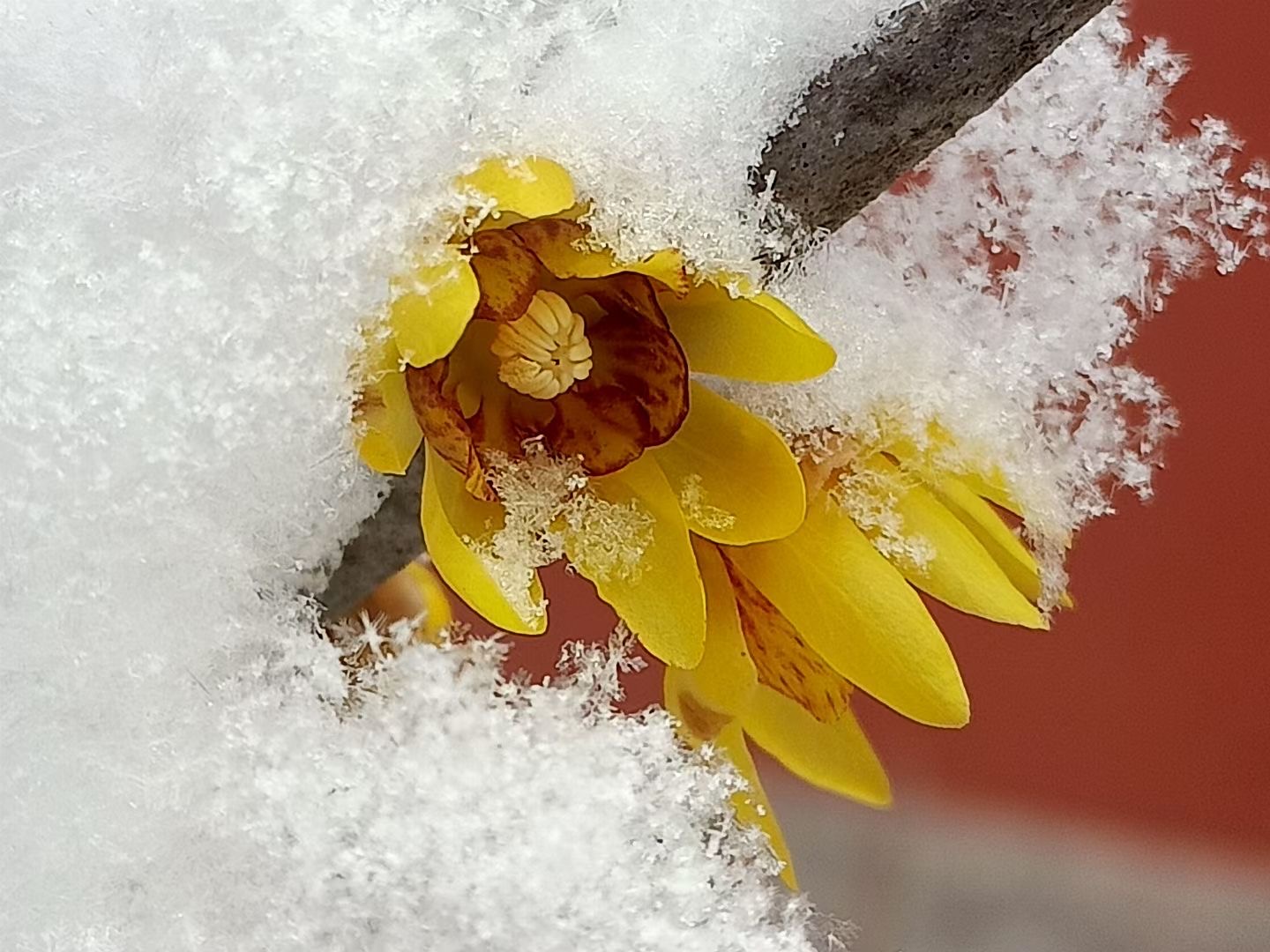 「雪と梅」;「白、赤、黄色の調和の世界」とても綺麗ですね。