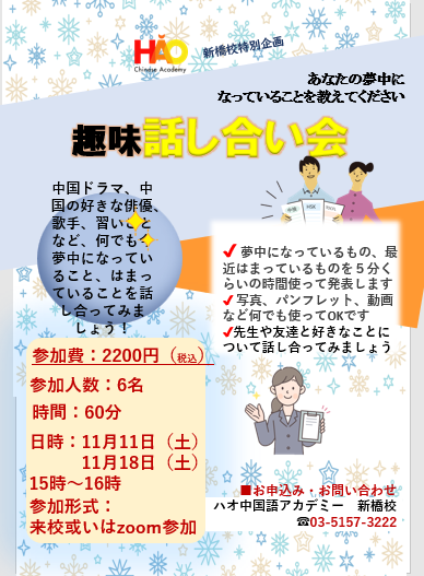 今日は中国語実践シリーズの「趣味・話し合い会」のご紹介です。