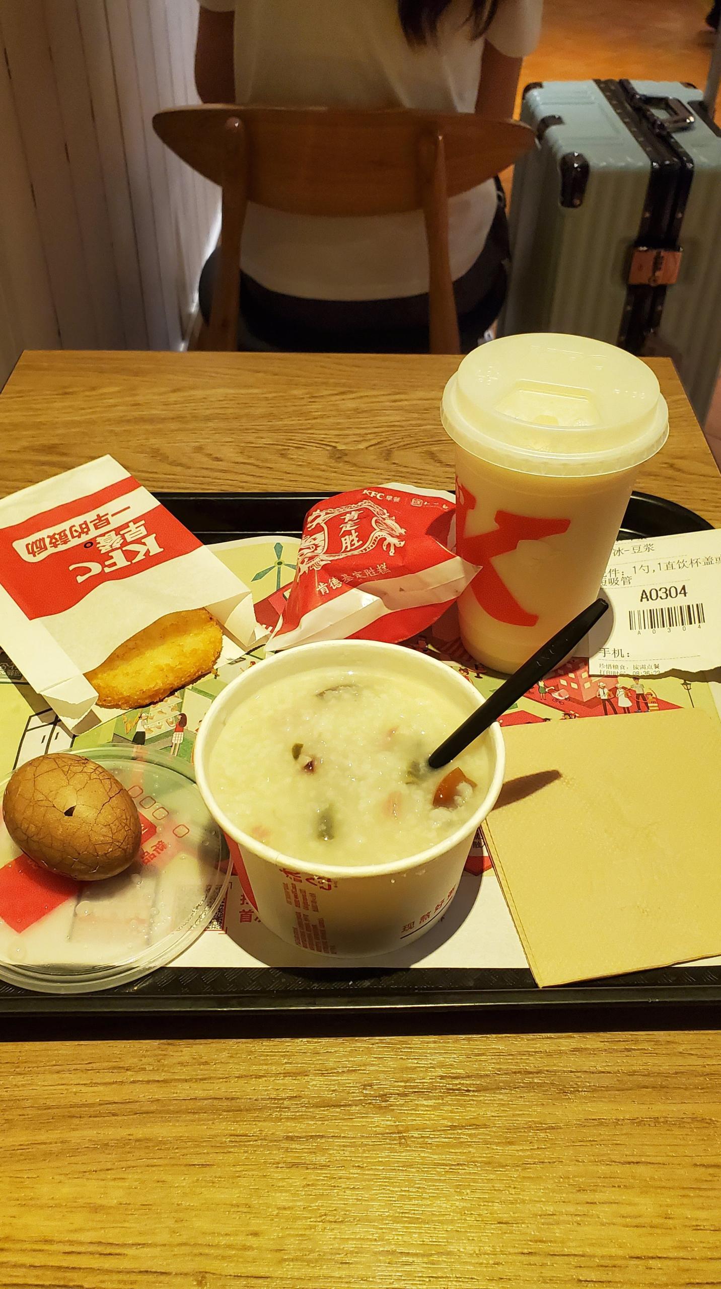 5,6肯德基和麦当劳的早饭:ケンタッキーでは豆漿とおかゆ(ピータンと鶏肉入り)とお茶で似たゆで卵、マクドナルドは油条と豆漿のモーニングセットでした。