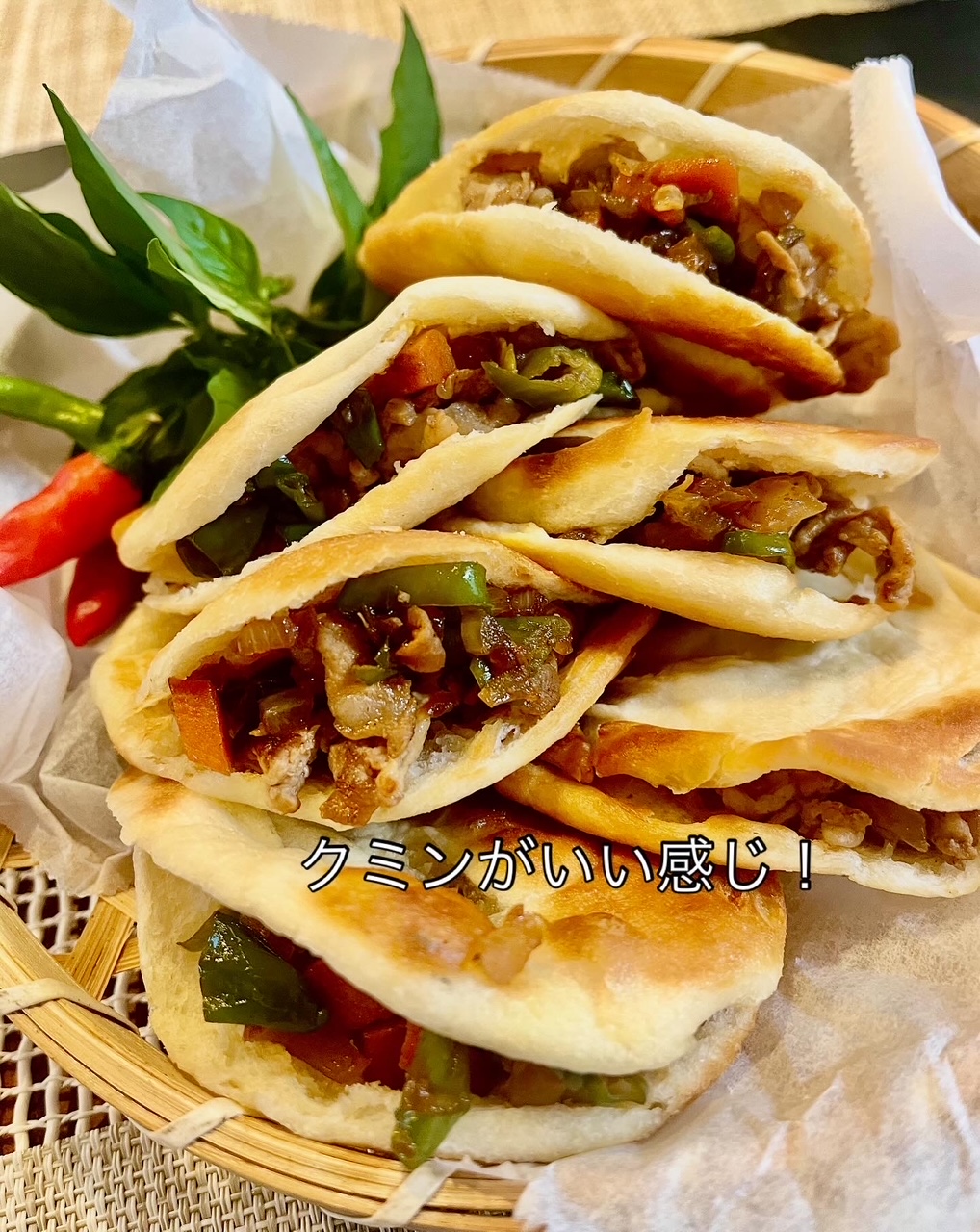こちらの「ロージャーモー(肉夹馍)」は、チャイナフェスタで食べた時に美味しかったので、家庭菜園で取れた野菜を使って、作ったようです。驚異の料理センス、私には絶対無理です;