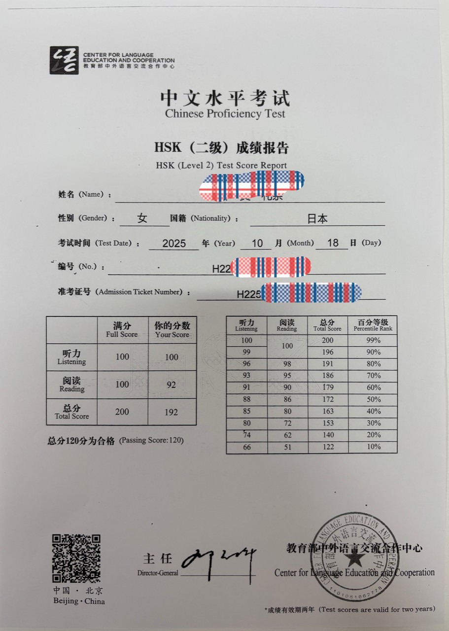 M・R様、2025年10月18日のHSk2級、ご合格おめでとうございます!