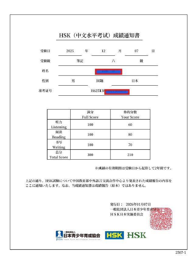 Y・T様、2025年12月7日のHSk6級、ご合格おめでとうございます!