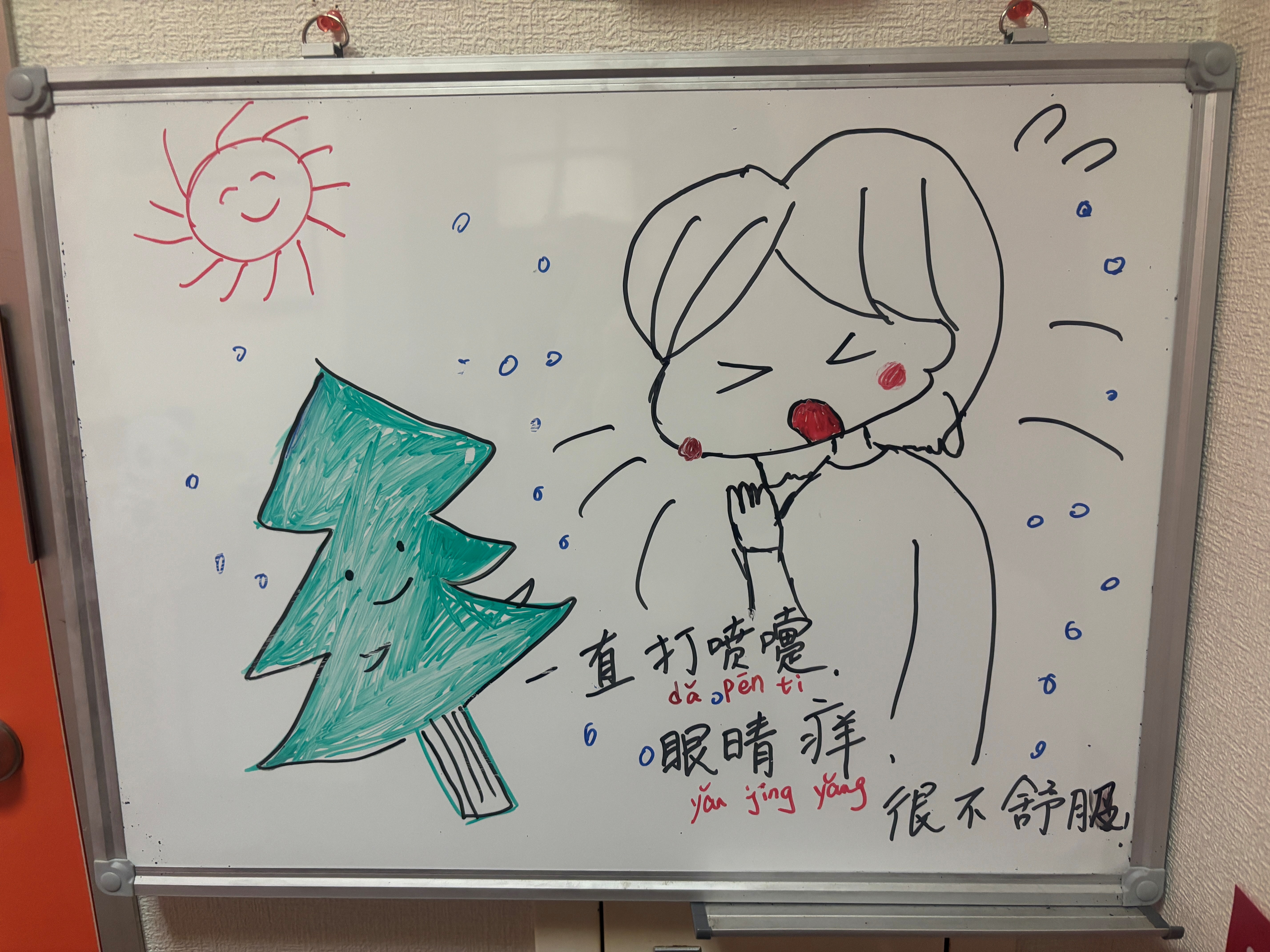 学校の入り口のホワイトボードには、学校の安先生が書いた花粉症絵を飾ってあります。腕前はいかがでしょうか?学校にいらっした時は、ぜひその中の中国語もチェックされてくださいね~