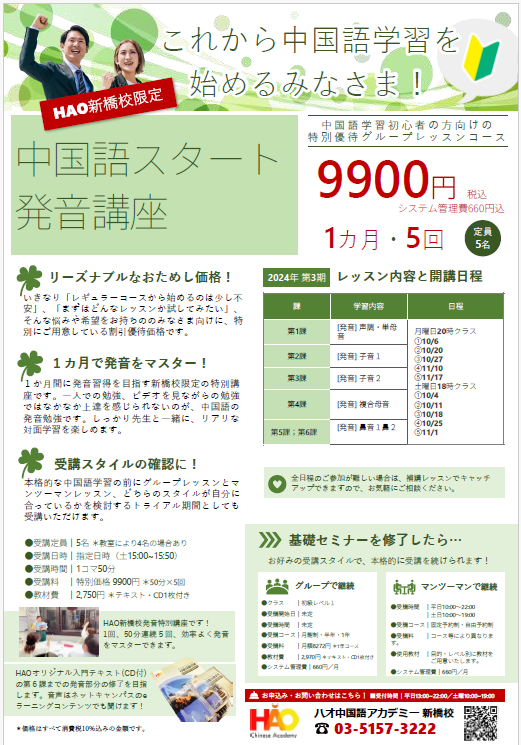 新橋校では、不定期に年8回くらい、発音に特化した中国語基礎セミナーを行っております。