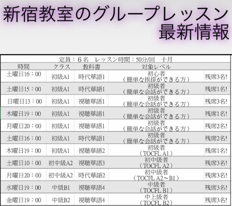 | 入門 | 日常漢語会話発音 | 木曜日20:00 | 入門者 | 残席2名! |