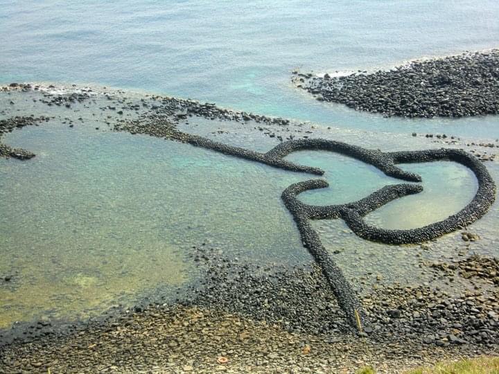 石滬は玄武岩と珊瑚礁で作られていて、魚をとるための仕掛けです。