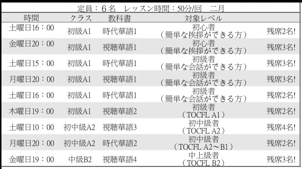 | 初級② | 日常漢語会話② | 金曜日20:00 | 初級者(簡単な挨拶ができる方) | 残席2名! |