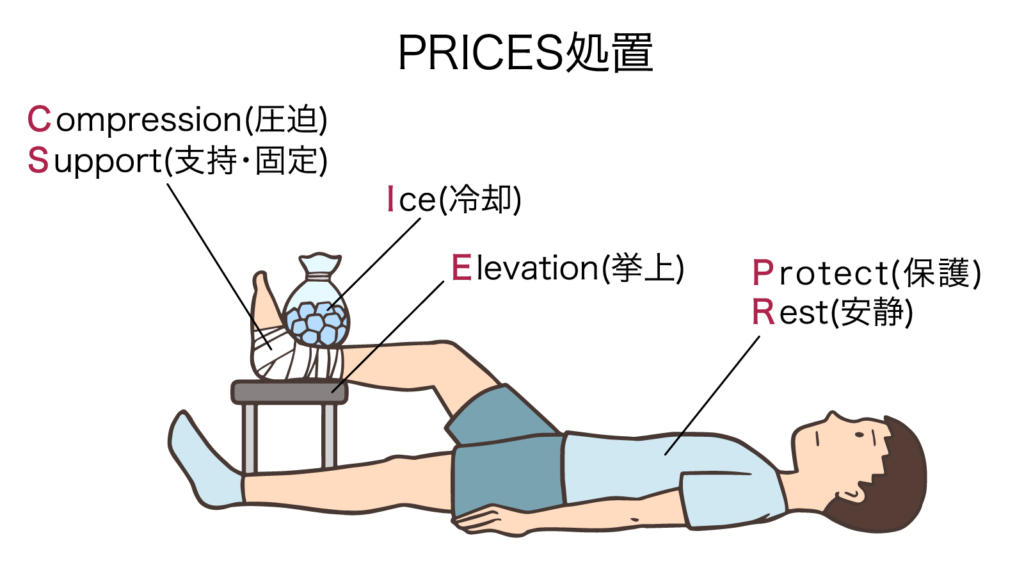 応急処置の基本方法は、PRICES(プライシス)処置と呼ばれているそうです。