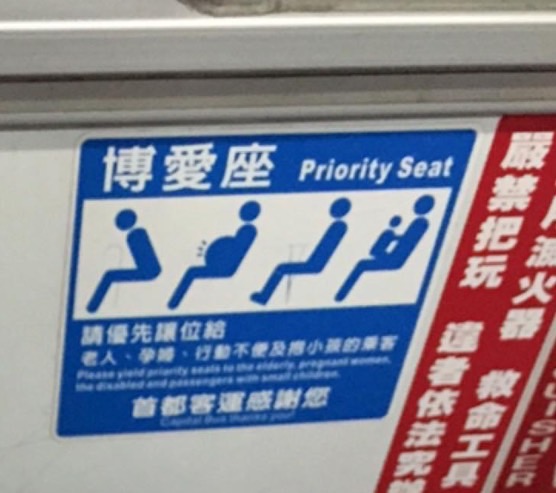 ちなみに、博愛座bó ài zuò はお年寄り、妊婦、体が不自由な人、子供などの優先席です。